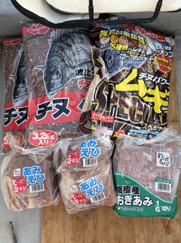 • マキエ:オキアミ2kg、アミ2角、チヌベスト2袋、チヌパワームギスペシャル 1袋