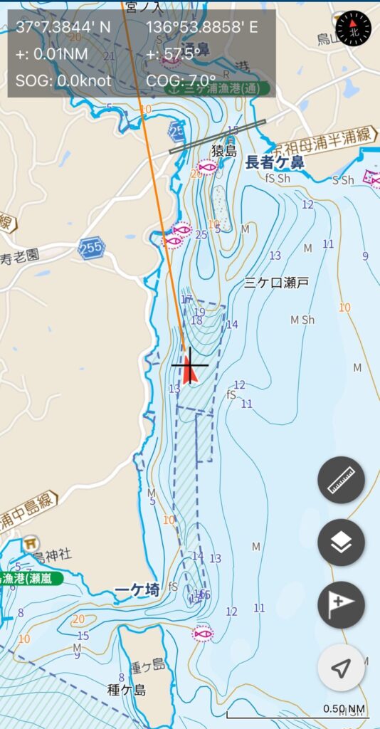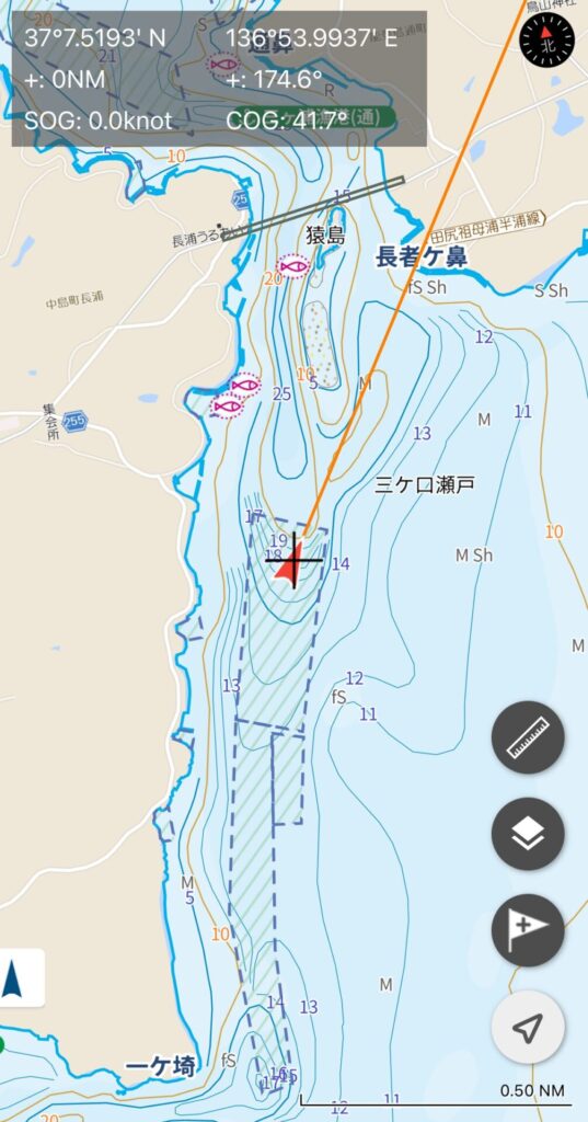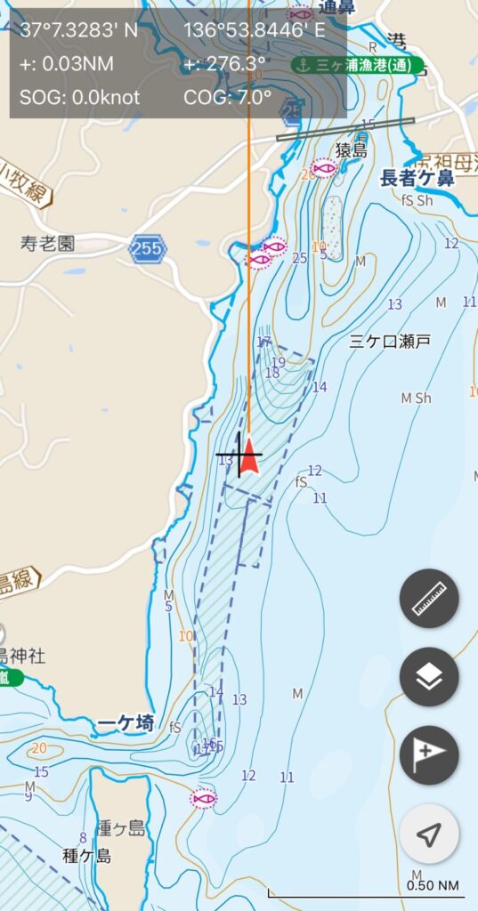 あさイチ、水深14mの浅場を探ったが、チヌの気配なし。