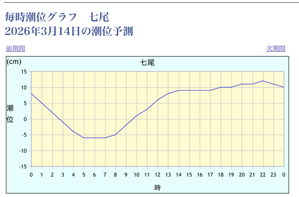 潮位グラフでは、6時17分、干潮後、潮が変わって、ツインブリッジから和倉方面に流れる上げ潮になるはずだった。