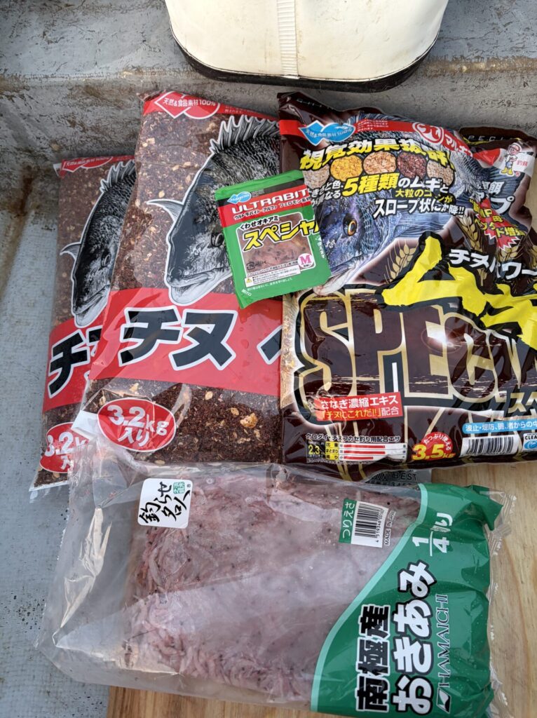 • マキエ:オキアミ3kg、チヌベスト2袋、チヌパワームギスペシャル1袋
