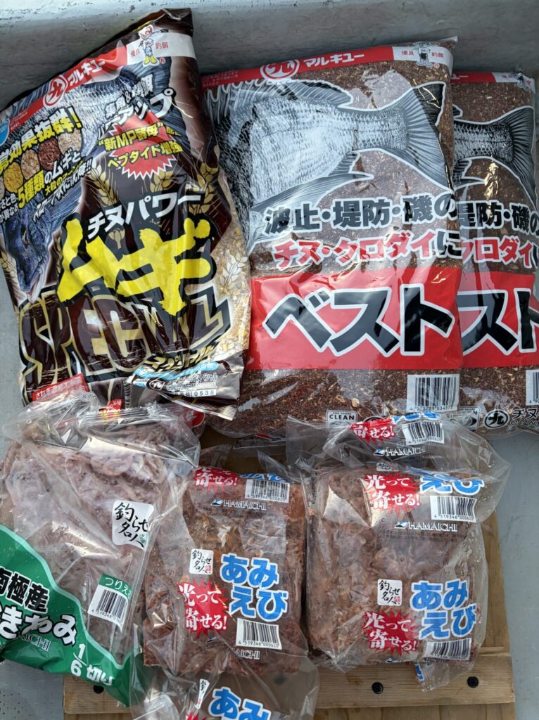 - マキエ:オキアミ2kg、アミ2角、チヌベスト2袋、チヌパワームギスペシャル 1袋