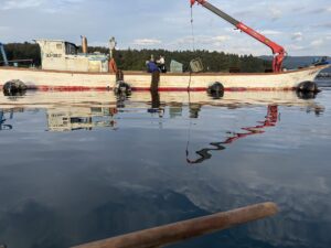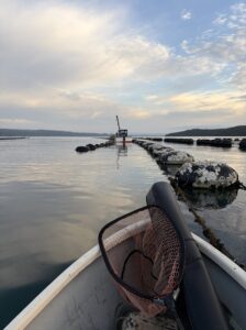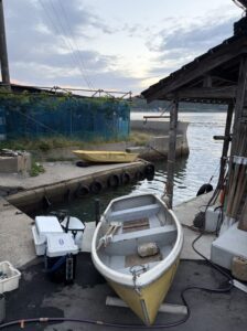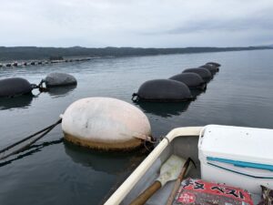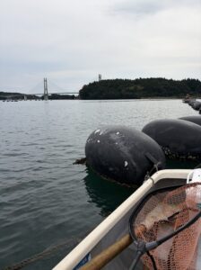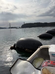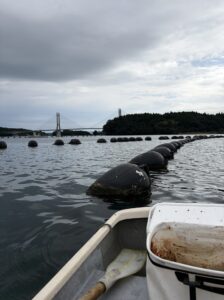 牡蠣棚全体の端っこで、牡蠣上げ作業をしていたので、その近くにボートをつけた。