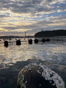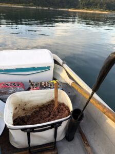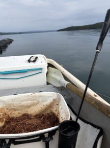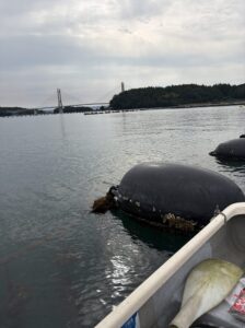 牡蠣棚全体の真ん中付近で、あまり牡蠣貝が付いてないところにボートを固定。