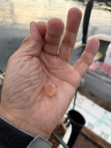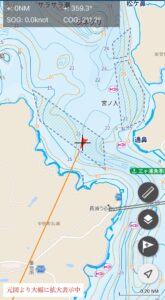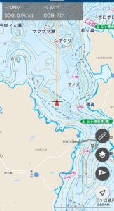 8時45分、朝イチのポイントは、牡蠣棚の岸側の端っこだったので、沖側の端っこにボートをつけた。