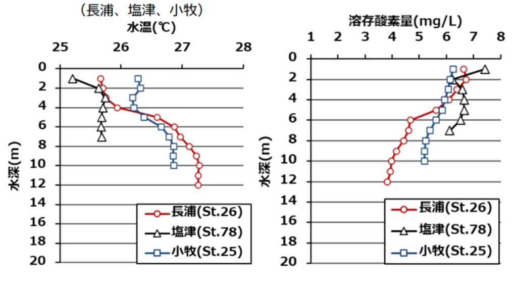 いつも見ている七尾湾情報を見ると、長浦は、9月と同様、10月も、引き続き、海水温が高く、溶存酸素濃度が低い。