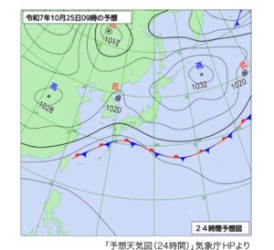 予想天気図は、高気圧圏内だけど、太平洋に前線、朝鮮半島に低気圧。