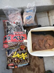 マキエは、アミ2角、オキアミ2k、チヌベスト1袋、チヌパワームギスペシャル1袋。