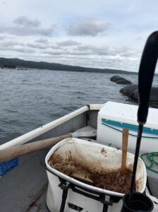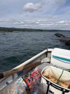 牡蠣貝がたっぷり付いた牡蠣棚にボートをつけた。