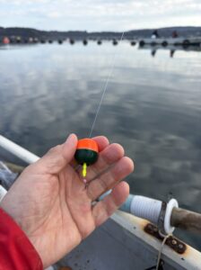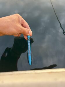 1.サシエを投入して、道糸につけた目印を見て、意図したタナまでサシエを沈める。