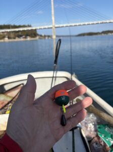 仕掛けは、こんな感じで、早い潮流に流されないように、タングステンシンカーをつけた。