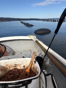 すなわち、牡蠣上げ船の作業中に、落ちてくる牡蠣貝に群がるチヌ狙い。