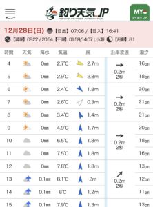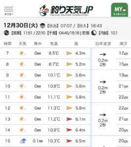 ツインブリッジのとの釣り天気の天気予報は、晴れだけど、西風が強く、最大6.5m。