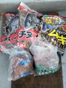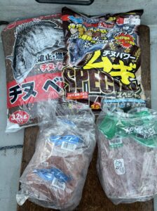 アミ1角、オキアミ2㎏、チヌベスト1袋、チヌパワームギスペシャル1袋。