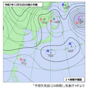 予想天気図は、太平洋に高気圧が二つ、北海道の北と北西に低気圧が二つ。