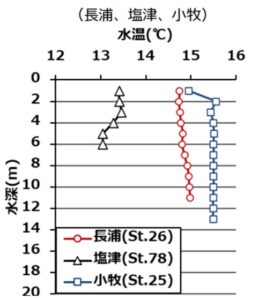 長浦の海水温の鉛直分布を見ると、まだ水温が全く下がっていない。